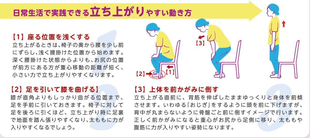 まずは日常生活から簡単に取り組める、立ち上がりやすい動き方を掲載しますので実践してみてください!
